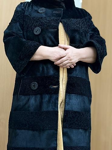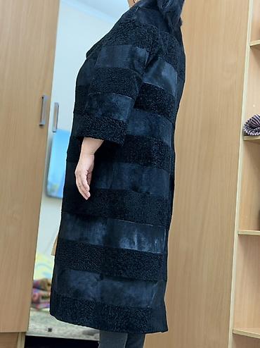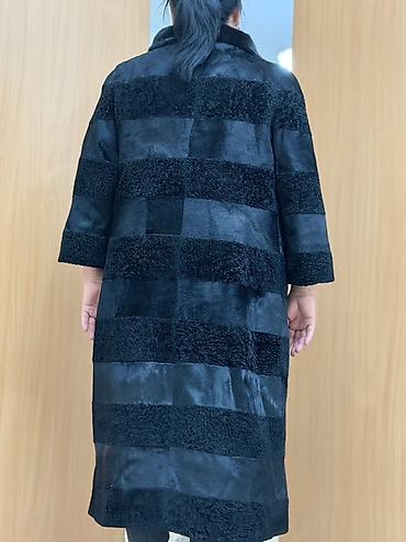 - Детали: крупные фактурные пуговицы в тон, поперечная раскладка меховых полос по всему изделию, аккуратные швы по спинке.