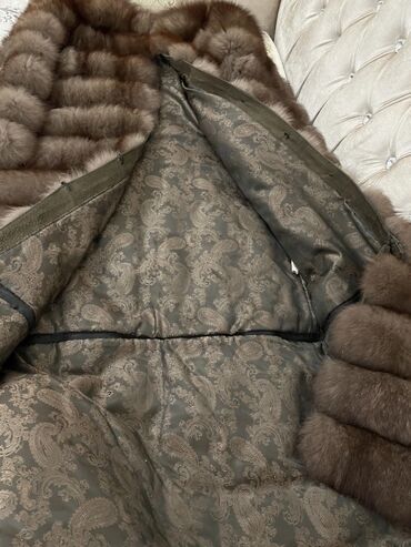 Женская шуба из натурального меха, выполненная в коричневом цвете. Модель имеет горизонтальную раскладку меха, что придает ей современный и стильный вид. Длинные рукава обеспечивают дополнительное тепло. Внутренняя подкладка с узором "пейсли" добавляет изысканности. Идеально подходит для холодного времени года, обеспечивая комфорт и элегантность.