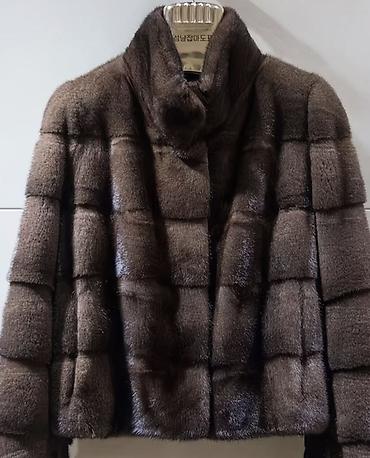 Шуба из норки, цвет графитово-ореховый (теплый тауп/какао). Модель: укороченная длина до бедра, свободный силуэт. Крой: поперечная раскладка меха, объемный английский воротник с возможностью за...