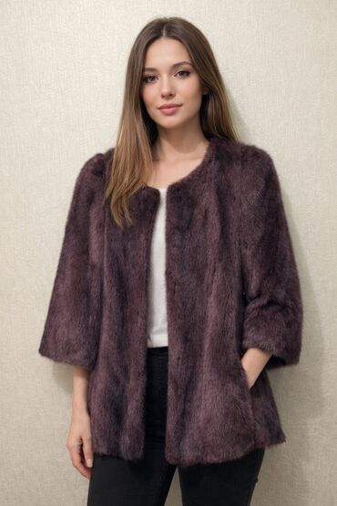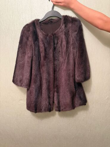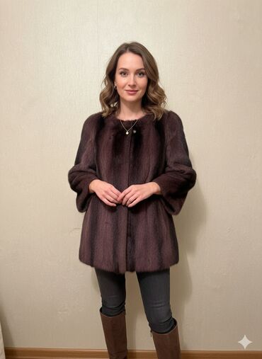 Шуба из натурального меха (норка) с круглым вырезом горловины. Размер 48-50.Цвет — глубокий сливово-бордовый с лёгкими затемнениями по вертикальным пластинам. Прямой силуэт до середины бедра, мягкая посадка по плечам. Рукав укороченный (примерно 3/4). Застёжка спереди — скрытая (крючки/петли), подкладка однотонная тёмная. Крой из продольных пластин, равномерный ворс средней длины, гладкая фактура.