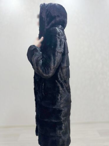 Шуба из черного меха с капюшоном - Модель: женская, прямой силуэт. -