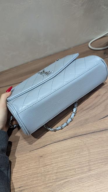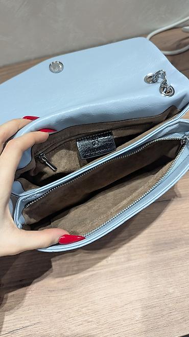 - Фурнитура: металл цвета серебра, фронтальный логотип-эмблема, люверсы под ремень-цепочку.