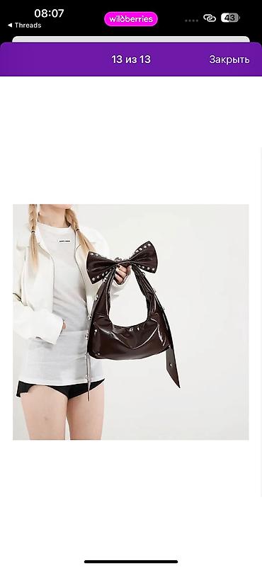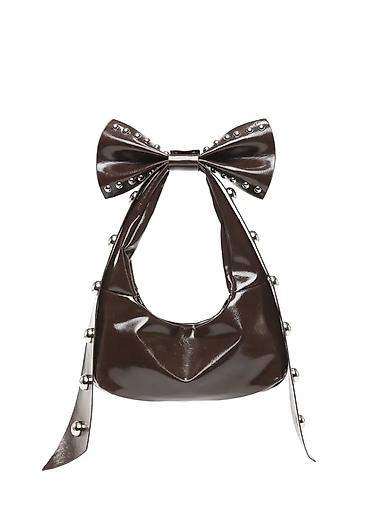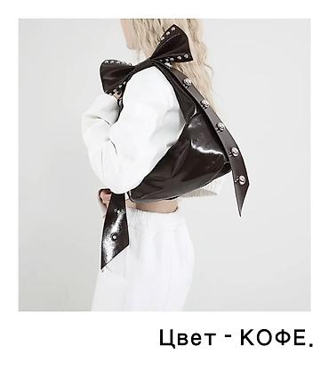 Сумка-хобо с бантом и декоративными металлическими кнопками/полушариями по ремню и банту. Глянцевая экокожа, цвет — кофе (темно-коричневый). Компактная полукруглая форма, мягкий корпус. Широкий ремешок переходит в крупный бант на плече, создавая акцентный силуэт. Закрытие — верхнее (каркас без видимой фурнитуры на клапане), одно основное отделение. Подходит для повседневных и вечерних образов, сочетается с базовыми и трендовыми вещами. Размер — средний, удобно носить на плече. Стиль: Y2K/панк-глам с женственными деталями.