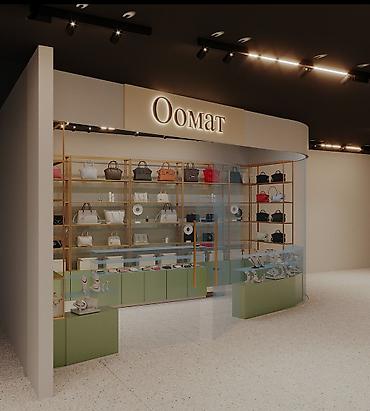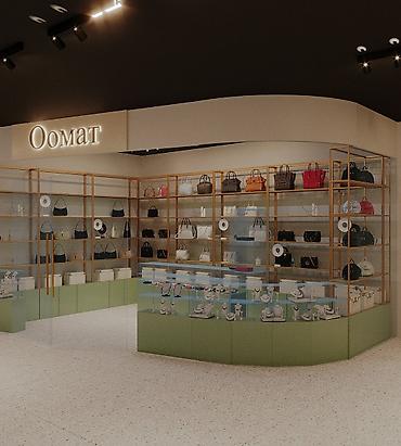 - Дизайн магазина: светлое пространство с точечным и трековым освещением, открытые стеллажи в золотистых рамах, изогнутая стеклянная витрина у входа с логотипом «Оомат».