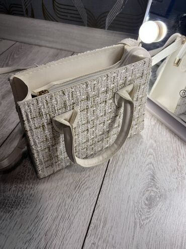 - Материал корпуса: текстиль с плетением «твид» в светло-молочном оттенке с золотистыми нитями.