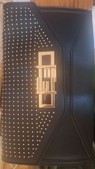 2) Клатч чёрный с декоративными заклёпками. Ассиметричный дизайн лицевой стороны: левая часть усыпана мелкими металлическими пупырчатыми точками, правая — гладкая. Акцентная прямоугольная застёжка с глянцевой вставкой и золотистым каркасом. Жёсткие формованные стенки держат форму.