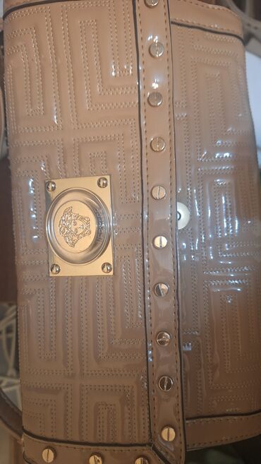 3) Клатч/сумка бежевого цвета из лакированной экокожи с простроченным геометрическим узором. Вертикальная полоса со шпильками-заклёпками по центру, спереди — металлическая декоративная табличка с рельефным медальоном. Закрывается на магнитную кнопку.