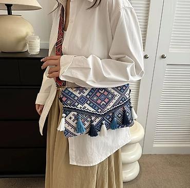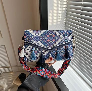 - Дизайн: яркий этнический геометрический орнамент; фронтальный клапан; декоративная бахрома-кисточки по линии клапана.