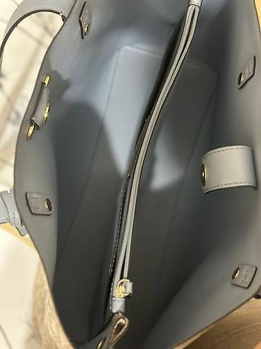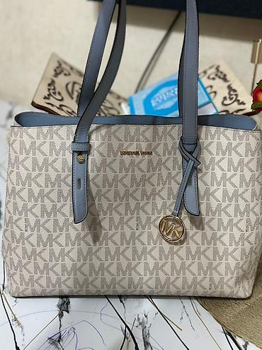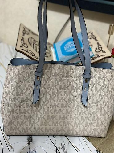 - Материал: фирменный канвас с монограммой MK по всему корпусу, отделка и ручки из гладкой экокожи серо-голубого оттенка.