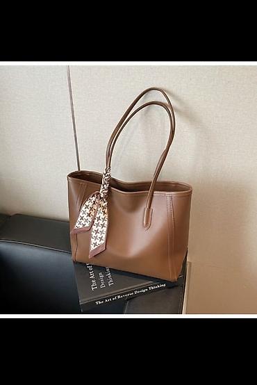 Стильная женская сумка-шоппер - Форма: классический прямоугольный тоут - Материал: гладкая экокожа с матовым финишем - Цвет: черный коричневом - Декор: съемная атласная лента/платочек с геометрич...