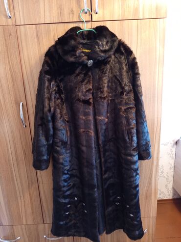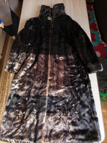 Размер 58 .Длинная женская шуба из тёмного меха (натуральный блестящий ворс, ровный густой подпушек). Классический прямой крой до икры, рукава полной длины с лёгким объёмом. Застёжка по центру: потайная молния/крючки и декоративная крупная пуговица у воротника. Воротник стойка-поло, можно носить поднятым для защиты от ветра. Подол украшен фигурной строчкой и аккуратными вставками с россыпью небольших декоративных камней/страз. Подклад тёмный гладкий. Есть втачные боковые карманы. Цвет — глубокий тёмно-шоколадный/чёрный с естественным переливом. Отлично подходит для зимы, выглядит элегантно и тепло. Размер ориентировочно средний–крупный (длина по фото — макси).