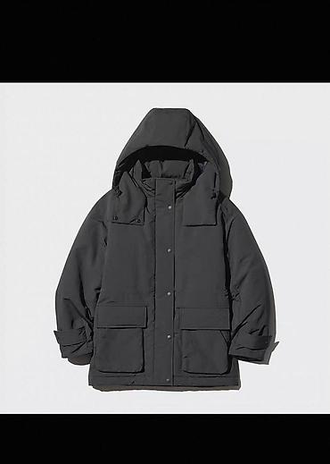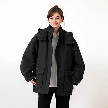 - Дизайн: свободный крой с удлинённым силуэтом, высокий воротник-стойка, объёмный капюшон.