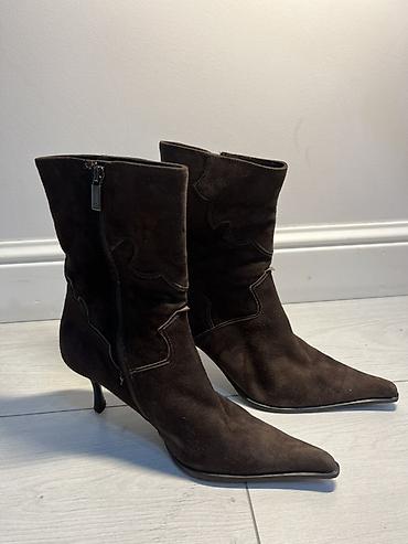 Женские ботинки-ботильоны из замши, черного цвета. - Форма носка: острый - Высота голенища: до щиколотки - Застежка: боковая молния с язычком - Материал верха: натуральная замша - Стиль: минимализм...