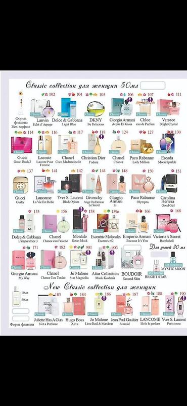 - Classic collection: популярные композиции от свежих цитрусовых и цветочных до гурманских и восточных. На подборках представлены варианты: Lanvin Éclat d’Arpège (№102), Dolce & Gabbana Light Blue (№104), DKNY Be Delicious (№105), Giorgio Armani Acqua Di Gioia (№106), Chloé Eau de Parfum (№107), Versace Bright Crystal (№111), Gucci Rush 2 (№114), Lacoste Pour Femme (№116), Chanel Coco Mademoiselle (№117), Christian Dior J’adore (№118), Chanel Chance (№127), Paco Rabanne Lady Million (№128), Escada Moon Sparkle (№130), Gucci Guilty (№137), Lancôme La Vie Est Belle (№141), Yves Saint Laurent Black Opium (№142), Givenchy Ange ou Démon Le Secret (№144), Giorgio Armani Si (№148), Paco Rabanne Olympea (№150), Carolina Herrera Good Girl (№151), Dolce & Gabbana L’imperatrice 3 (№153), Chanel Chance Eau Fraîche (№156), Montale Roses Musk (№158), Escentric Molecules 02 (№159), Emporio Armani Because It’s You (№166), Victoria’s Secret Bombshell (№168), Giorgio Armani My Way (№171), Chanel Chance Eau Tendre (№182), Jo Malone Star Magnolia (№901), Attar Collection Musk Kashmir (№903), Boudoir Second Skin (№904), и др.