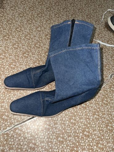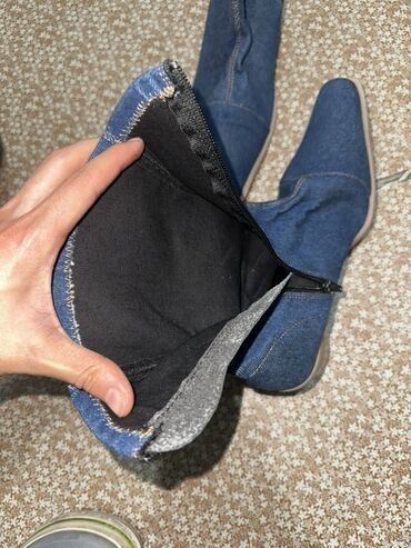 - Материал верха: плотный синий джинс (деним) с контрастной декоративной строчкой «зигзаг» по краю голенища.