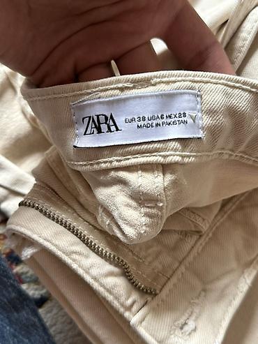 2) Светлые (молочные) джинсы ZARA, размер на бирке EUR 38 / USA 6 / MEX 28. Молния спереди, пять карманов, необработанный край на линии колена как декоративный элемент.