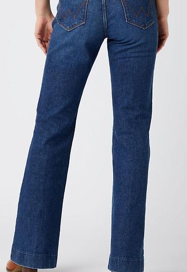 Джинсы клёш, женские. - Модели: черные и синие (деним с легким эффектом потертостей спереди). - Посадка: средняя. - Крой: классический 5‑карманный, клёш от колена, широкие расклёшенные штанины. - ...