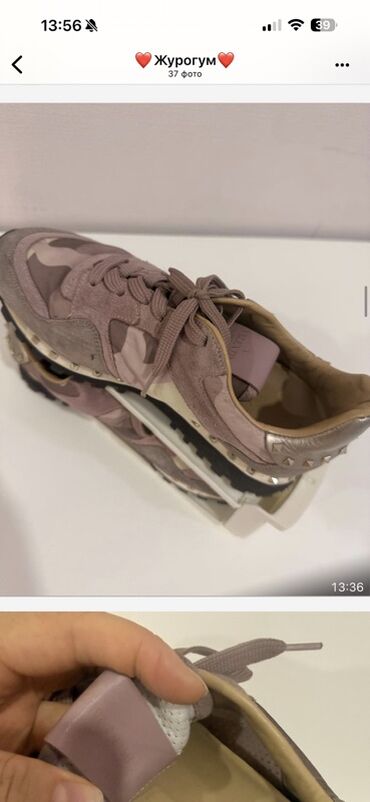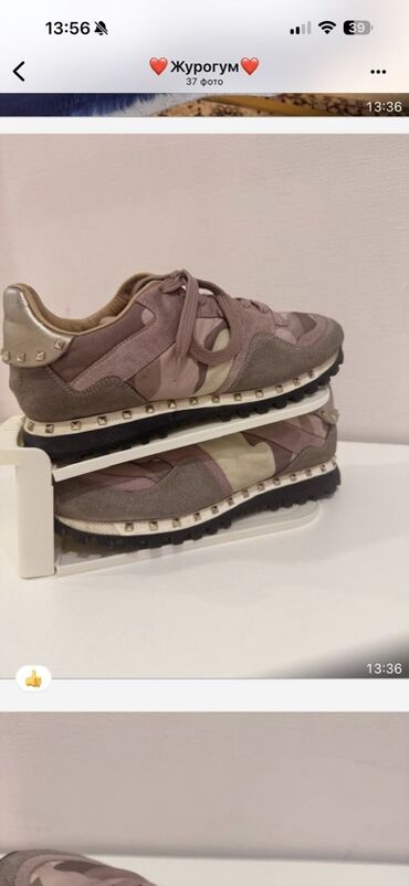 Кроссовки в камуфляжной гамме (приглушённые розово-бежевые и серые оттенки) с декоративными заклёпками по периметру подошвы и на пятке. Верх комбинированный: натуральная замша, текстиль и гладкая кожа; на язычке — кожаная накладка. Классическая шнуровка, мягкий ворот и подкладка для комфорта. Рельефная чёрная подошва с хорошим сцеплением, промежуточный слой — светлый с металлическими шипами-«пирамидами». Формa — низкая, универсальная для повседневной носки. Стиль — спортивно-уличный с акцентной отделкой.