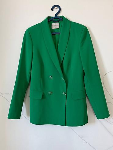 - Изумрудный двубортный пиджак с мягкими лацканами-шалькой, 4 пуговицы, карманы с клапанами.