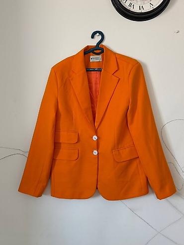 - Яркий оранжевый однобортный пиджак на 2 пуговицах, с лацканами и накладными клапанами карманов.