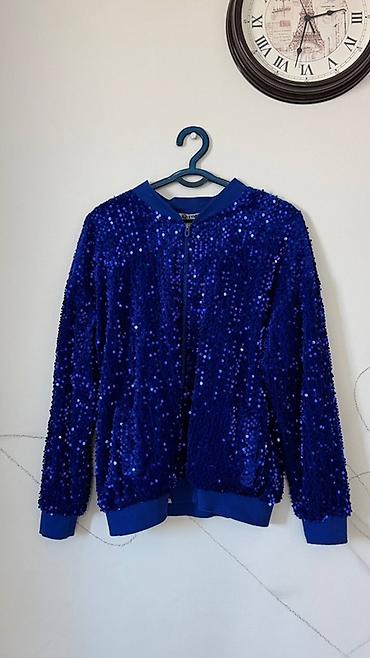 - Синий бомбер, полностью усыпан пайетками, на молнии, трикотажные манжеты и нижняя резинка.