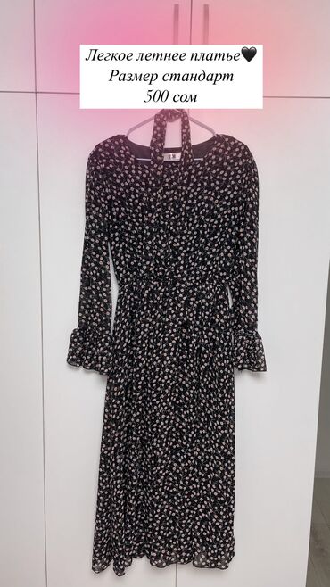 Платья женские, несколько моделей: 1) Черное миди с мелким светлым цветочным принтом. Свободный силуэт, длинный рукав, отложной воротник, планка на пуговицах. Цена на фото: 500 с. 2) Темно-синее/...