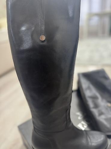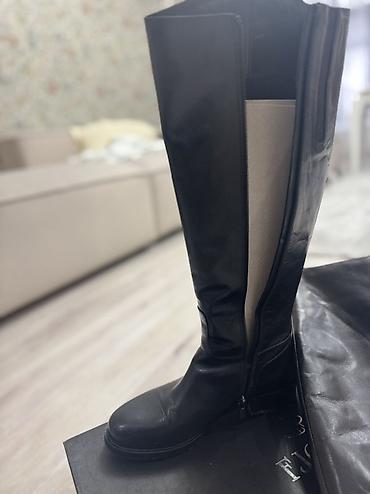Высокие женские сапоги из черной гладкой кожи. - Высота голенища: до колена. - Материал верха: натуральная кожа с матовым блеском. - Подошва: прочная рифленая, обеспечивает хорошее сцепление. - Ка...