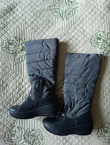 3) Зимние серые сапоги на платформе, размер 37. Верх — стёганый материал, нижняя часть — лаковый/резиновый глянец, боковая молния. Цена: 500 сом.