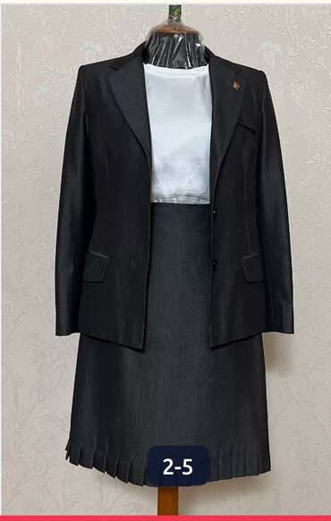 - Юбка: длина до колена, прямой крой, плиссированная отделка по низу