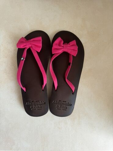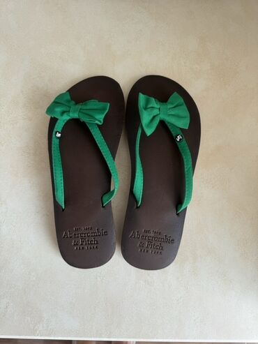 Женских шлепанцы от Abercrombie & Fitch с декоративными бантиками. Одна пара имеет зеленые ремешки и бантики, другая – розовые. Подошва коричневого цвета с логотипом бренда. Удобный и стильный вариант для летнего отдыха.