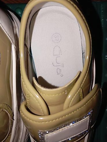 - Дизайн: глянцевый верх в бежево-молочной гамме, широкий ремень-липучка с прямоугольной нашивкой, обрамлённой стразами. Носок украшен металлической пластиной с надписью “FASHION”.