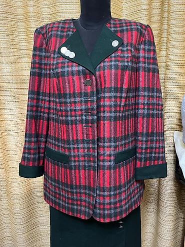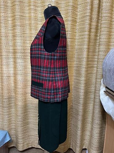 - Жакет на подкладке из плотной ткани с красно‑черно‑серым тартаном. Прямой силуэт, длина до бедра. Акцентный отложной воротник и манжеты из темно‑зеленого фетра/драпа, декоративные металлические пуговицы с тиснением. Два горизонтальных прорезных кармана с темно‑зелеными листочками.