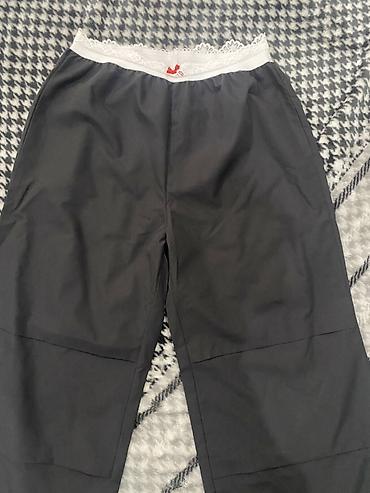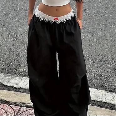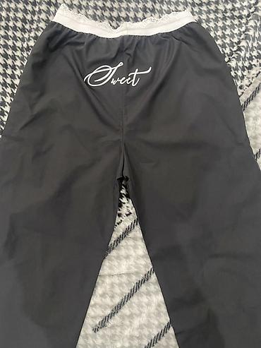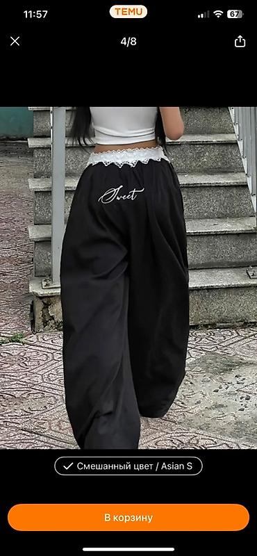 - Низ: свободные брюки темно‑серого цвета, широкая эластичная белая резинка на поясе с кружевом; на задней части принт “Sweet”.