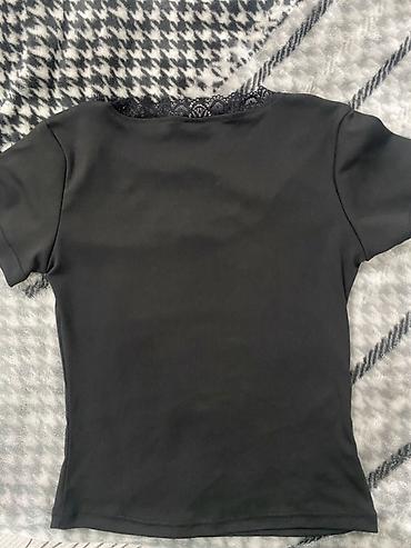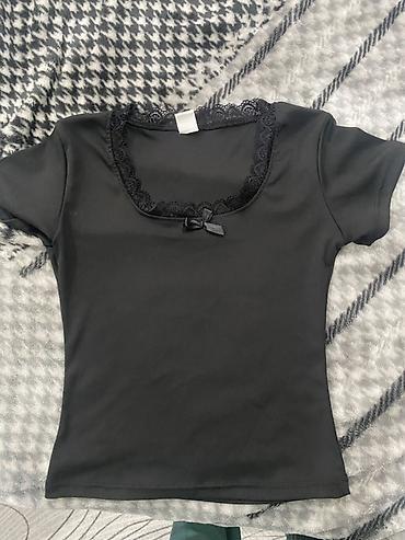 - Верх: черная футболка с коротким рукавом, мягкая эластичная ткань, квадратный вырез, оформленный кружевной окантовкой, спереди аккуратный бантик.