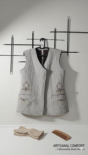 - Декоративная вышивка у карманов (растительные мотивы в бежево-коричневых тонах)