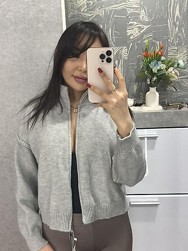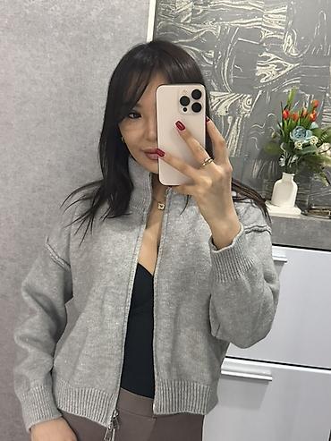 - Фасон: укороченный кардиган-бомбер с высоким воротником-стойкой.