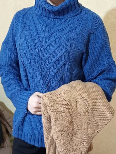 - Объёмный свитер с рельефным узором «ёлочка» и высоким воротником‑гольфом; демонстрируется в синем, также представлен бежевый вариант.