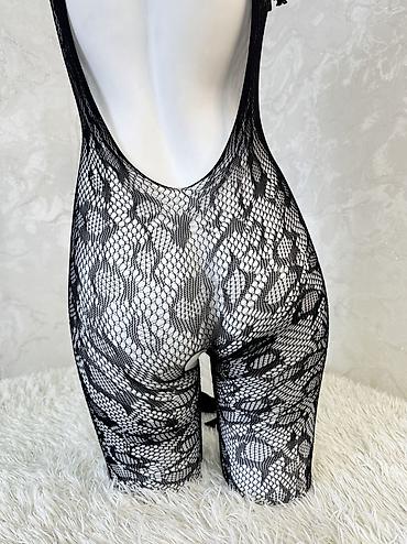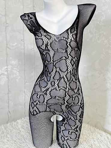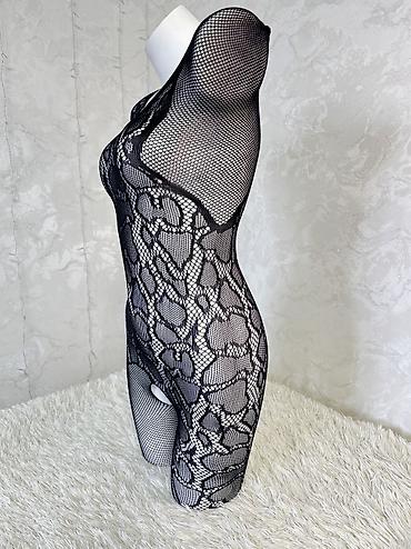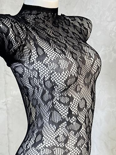 - Модель: бесшовный боди-комбинезон с крупным ажурным рисунком, имитирующим кружево/сетку.