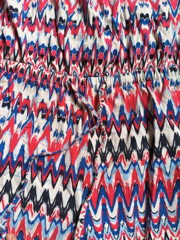 Летний женский комбинезон с ярким узором в виде зигзагов. Модель без бретелек обеспечивает открытые плечи, а эластичная талия со шнурком подчеркивает фигуру и обеспечивает комфортную посадку. Узор в синих, красных, черных и белых тонах придает изделию динамичный и стильный вид. Идеально подходит для летних прогулок, отдыха или создания повседневных образов.
