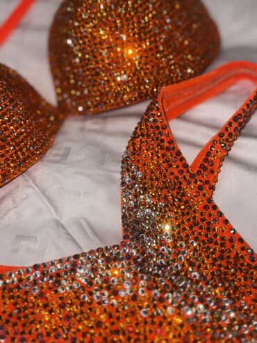 - Трусики: классический крой с эластичными оранжевыми бортами, передняя часть инкрустирована стразами.