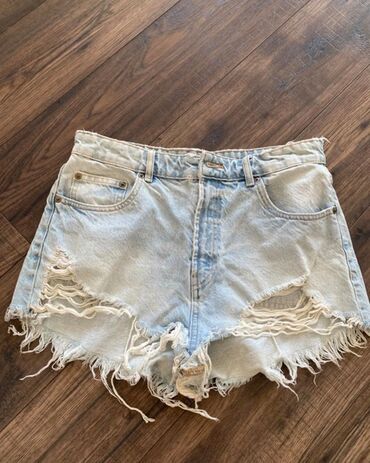 - Джинсовые шорты: выполнены из светло-голубого денима, высокая посадка, 5 карманов, необработанный край низа с выраженной бахромой, длина до колена.