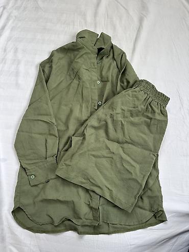 Состав по ощущениям: костюм — плотная костюмная ткань; оливковый комплект — натуральная текстура; топ — эластичный трикотаж. Размеры не указаны на фото — ориентируйтесь по визуальным пропорциям.