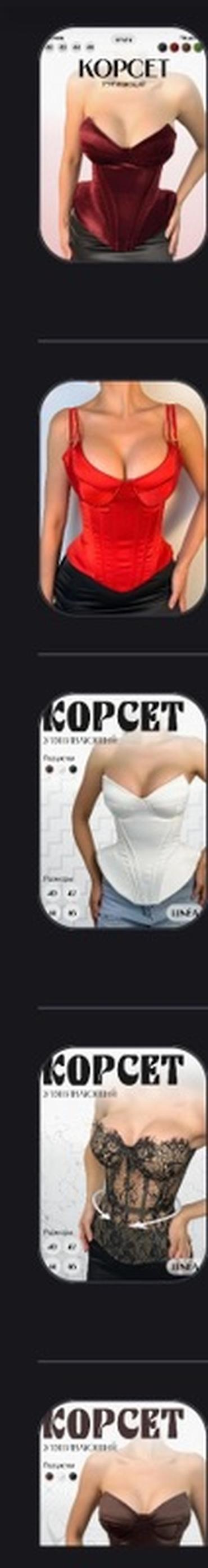 - Застёжки и регулировка: передняя/задняя шнуровка и/или крючки (на фото видны варианты), позволяет подогнать по фигуре.