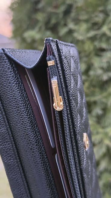 - Материал: фактурная чёрная кожа с фирменной ромбовидной стёжкой.