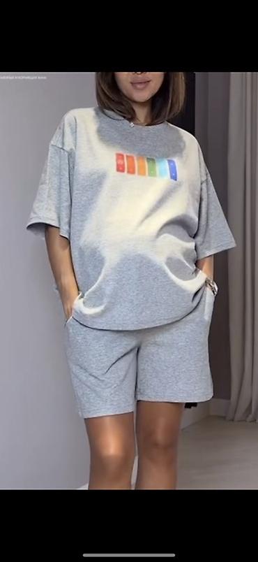 - Комплектация: свободная футболка с коротким рукавом и шорты до mid-thigh.
