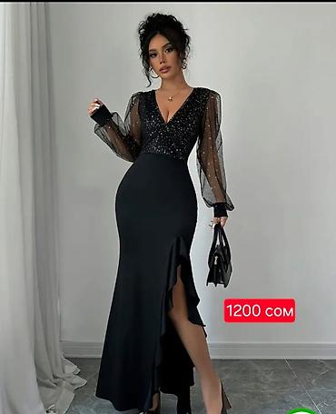 2) Вечернее платье в пол черного цвета: глубокий V-образный вырез, лиф со сверкающим покрытием, полупрозрачные рукава из сетки с манжетами, облегающий силуэт, разрез по ноге с волнистой оборкой.