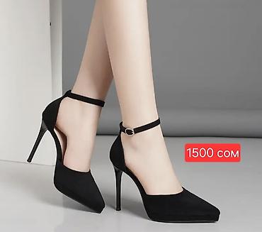 4) Туфли-лодочки на шпильке черного цвета: острый мыс, закрытый нос, открытая пяточная часть, тонкий ремешок на щиколотке с пряжкой, высокий каблук.