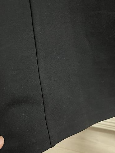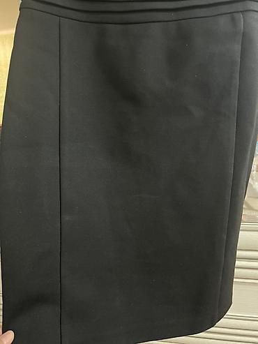 - Юбка прямая, черная, гладкая ткань, длина до колена/чуть выше (по фото), аккуратный шов по передней панели.