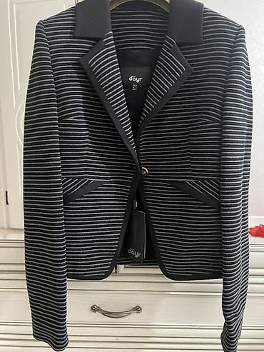 - Жакет на одной пуговице, полуприталенный силуэт. Лацканы и борта с контрастной окантовкой. Ткань фактурная, в горизонтальную полоску (черный/серый), мягкий трикотаж с рельефом. Два прорезных декоративных кармана с планками. Классический воротник, длинный рукав.