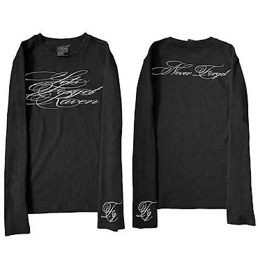 Дополнительно: на отдельных фото показан чёрный лонгслив с текстовым принтом готическим шрифтом (надпись на груди и спине, а также на манжетах). Длинные рукава, круглый вырез, рифлёная фактура трикотажа. Подходит для стритwear‑луков и многослойных сочетаний.